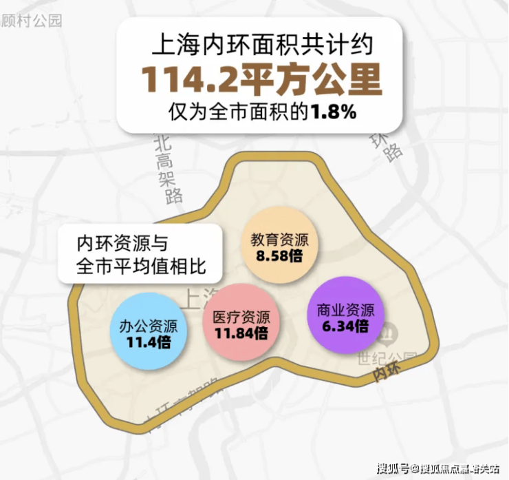 所有人都向往上海内环,内环内面积虽只占据上海1.8%的面积,却汇集了全上海最优质的资源——教育资源是全市平均值的8.58倍,医疗是11.84倍、商业6.34倍、办公11.4倍。(数据来源:上海统计年鉴)