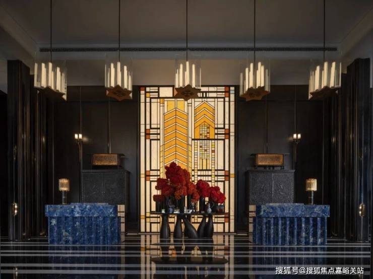 其次,项目的很多细节都融入了海派经典元素,比如落客区美轮美奂的 约300㎡彩色玻璃穹顶,艺术连廊拱形廊道灵感都来自和平饭店。彩绘花窗的拱门造型则取自武康大楼。