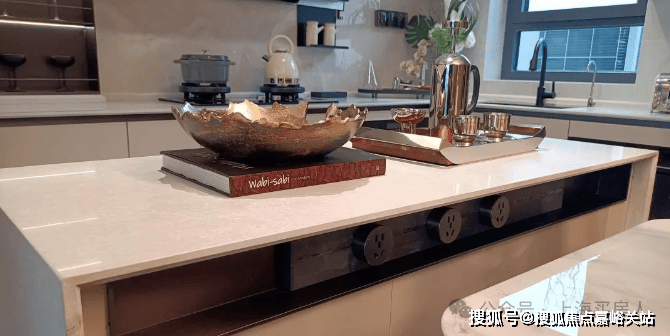 厨房额外标配带 有收纳柜体的岛台空间,轨道式插座同样是交付标准,厨房台面是和内环某10万+项目同款材料: