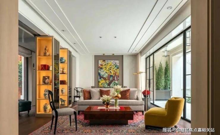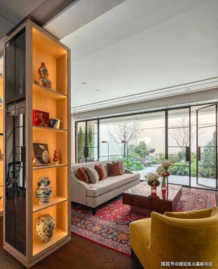 在客厅中,两个展示架巧妙地将空间分隔成主客厅区和休闲室,营造出一个与建筑尺度交相辉映的层次空间。