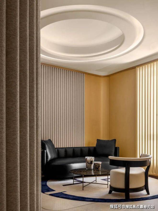 进入会所空间的步道中,蜿蜒曲折的墙面,犹如黄浦江江面,视觉上的无限延伸,不止是在简单诉说曲线的优美,更像是一场与陆家嘴澎湃城市气象的对话。