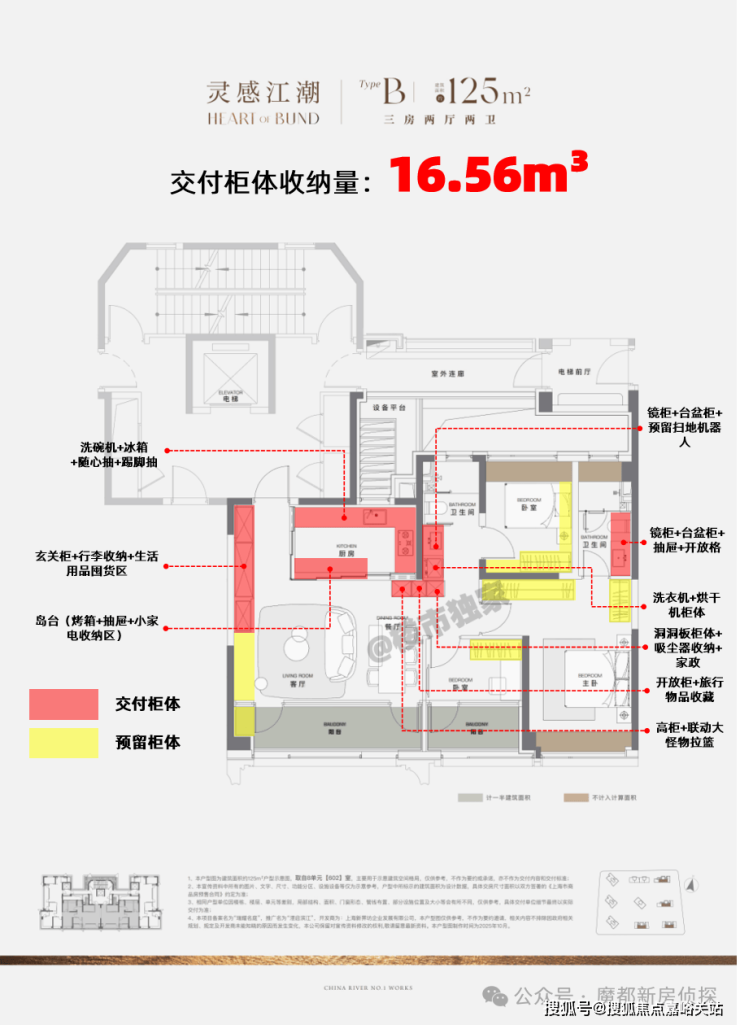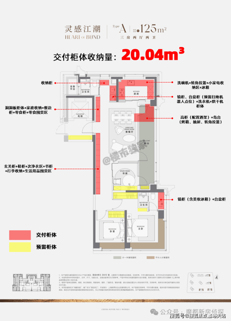 结合我们的户型模拟来看,该户型的整体交付柜子+预留衣柜,可以达到约20.04m³,什么概念呢?