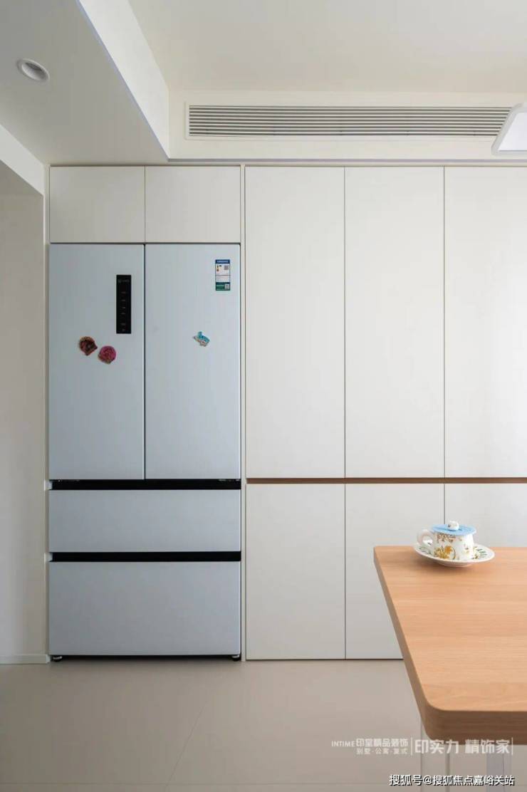 三面墙体皆做了满墙柜体设计,收纳储存直接拉满,靠近厨房的一侧还嵌入了双开门冰箱,既补充了厨房的储物空间,也能在书房办公时随手拿到冷藏的饮品与水果。