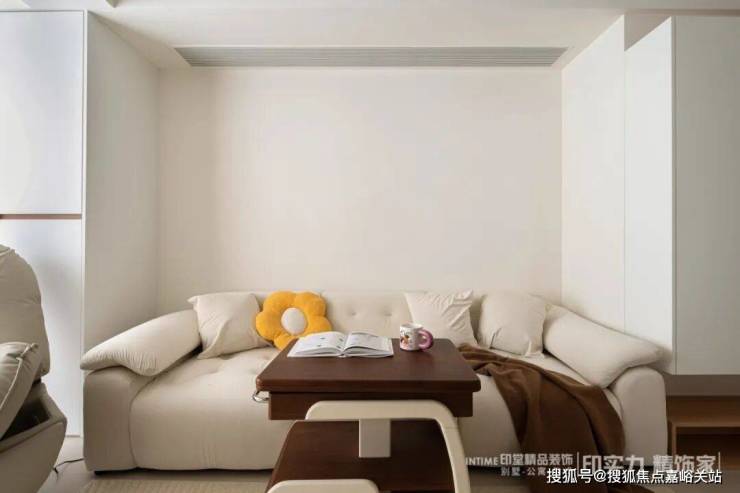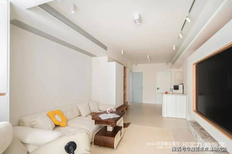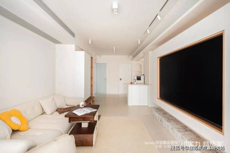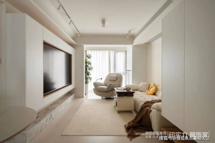 奶白色沙发作为视觉焦点,与整体风格完美融合。点睛之笔的回字形电视墙,不仅以独特的造型增强了空间的立体感,更巧妙地融入了大量收纳空间,让客厅在保持美观的同时,兼具整洁与实用。