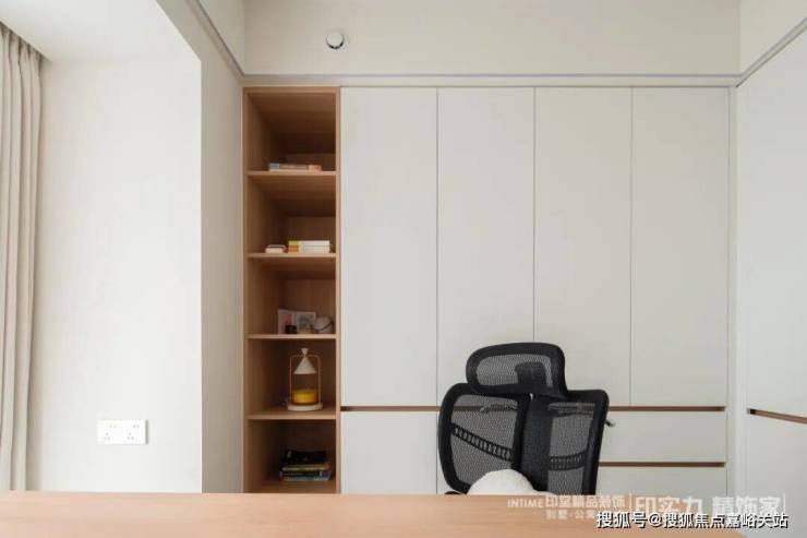 厨房左侧开辟出一间开放式书房,打破了传统空间的隔阂感,书房同样配备了飘窗,营造出安静又治愈的办公学习氛围。