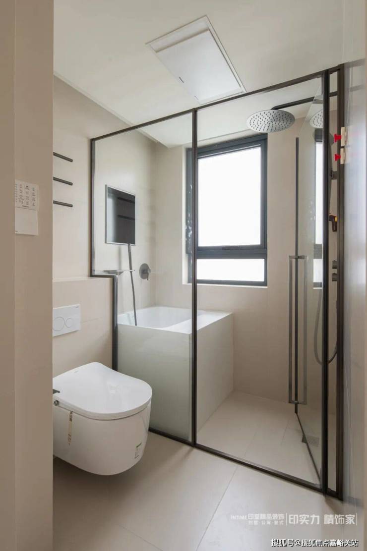 入户左手边的卫生间是干区,采用干湿分离设计,洗漱区外置,不用担心洗漱用品、护肤品会受潮变质,湿区被单独隔开,规划了卫浴设施与小型浴缸,打理方便。