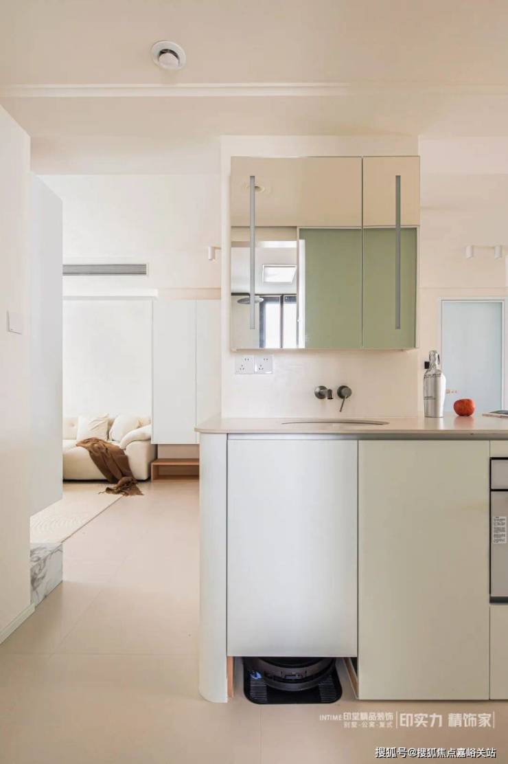 外侧一台小巧的咖啡机唤醒元气满满的一天,内侧藏着迷你洗手台,既延伸了视觉空间,又方便餐后随手清洁。下方还有嵌入式烤箱,烘焙甜点、加热餐食都很便捷,连扫地机器人的空间也被妥妥的安排上了,方寸之间尽显生活巧思。