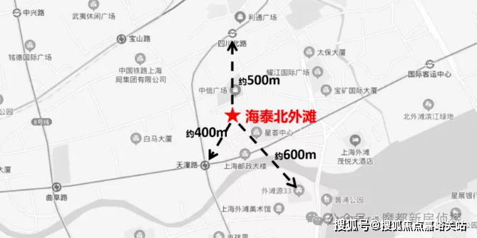 从地理坐标看,海滩北外滩直线距离外滩源仅600米,步行可达外白渡桥、上海邮政大楼等海派文化地标;