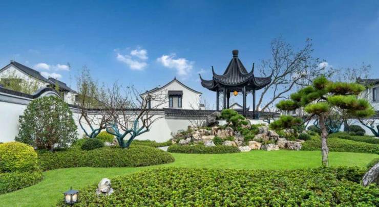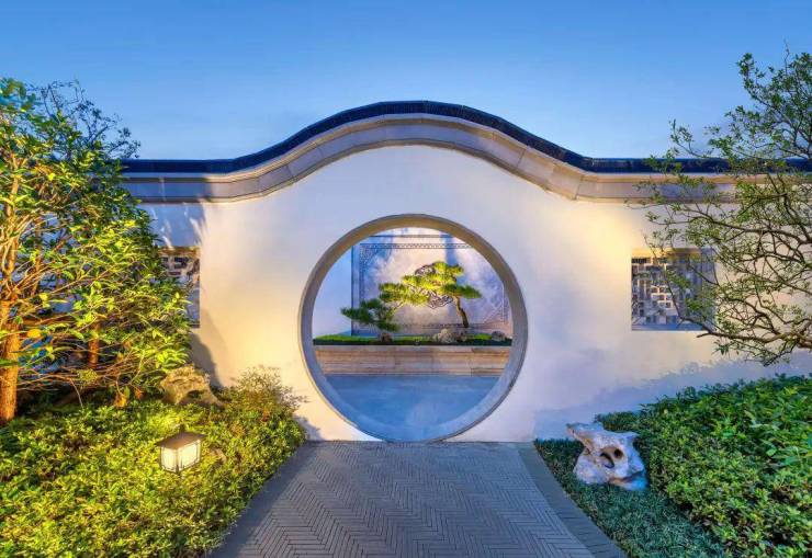 门口以百万黑松迎宾,彰显仪态万千,又选取了硕大的湖石平躺在照壁之下,与黑松相得益彰。借鉴四大园林中的“狮子林”布局门户,寓以照壁、松、石,体现居者的身份与贵气。