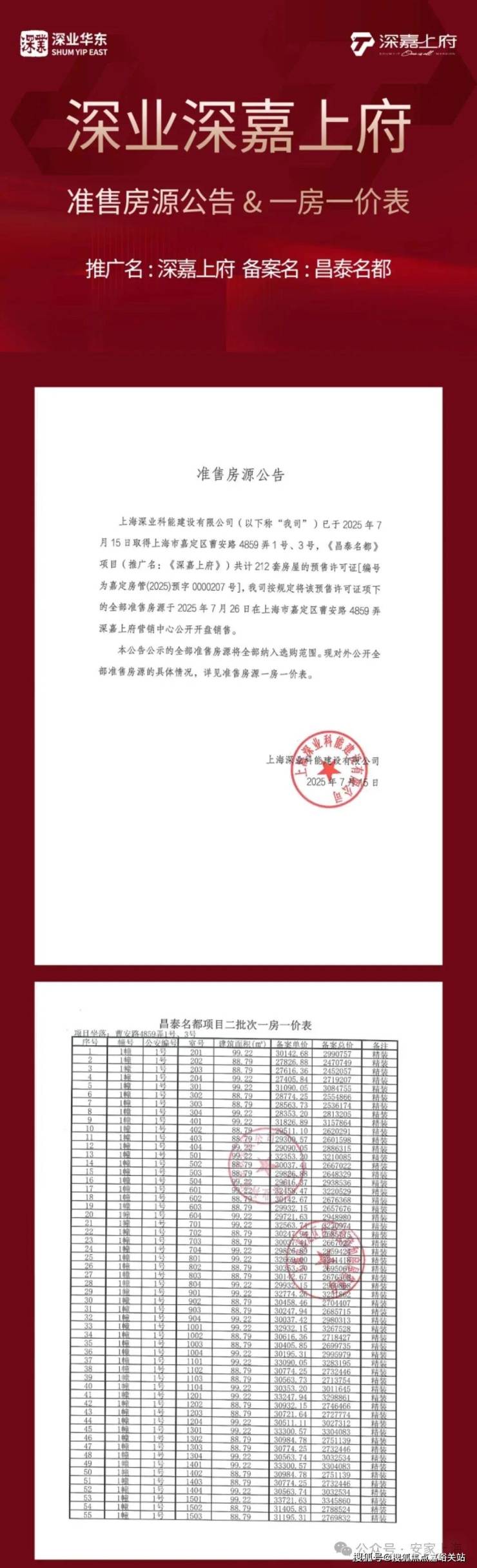 开发商:上海深业科能建设有限公司;推广名:深嘉上府、备案名:昌泰名都;预售许可证号:嘉定房管(2025)预字0000186号、嘉定房管(2025)预字0000207号;本宣传资料为要约邀请,针对本项目概况进行介绍,仅供参考不作为销售承诺。本项目不排除因政府相关规划、规定及开发商未能控制的原因而发生变化,最终以双方签署的正式《上海市商品房预售/销售合同》及其他相关协议文本为准。代理商:同策房产咨询集团股份有限公司、上海世联房地产顾问有限公司。发布日期:2025年07月,有效期3个月。广告/示意图