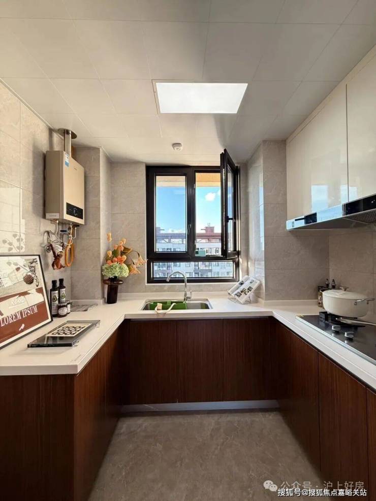 厨房采光面大且正对餐厅,东线布局合理,厨房U形布局使用率高;