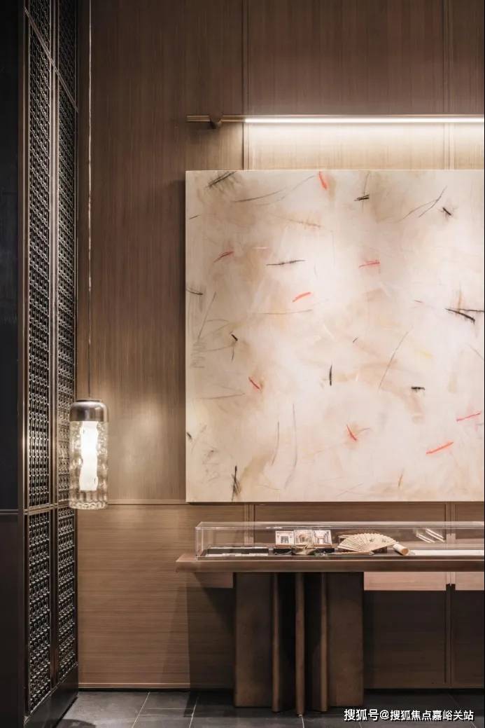 例如, 在归家的动线上,保利以古代“提灯夜游”为灵感,将“灯”这一意向穿插其中——在公区入户大堂内,造型别致的壁灯格外惹眼,其灵感来自于“中国古典豆形灯”; 落壁灯则是以古铜不锈钢搭配仿透光云石灯具,营造出朦胧的光晕氛围,颇具东方意蕴。