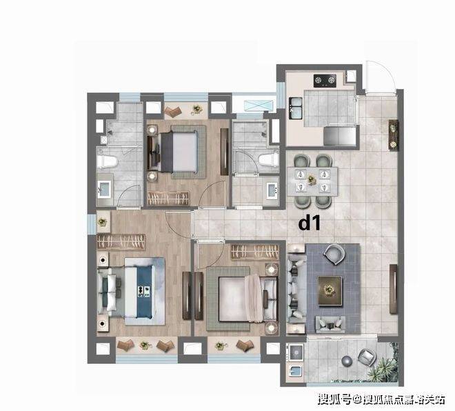 D1户型:建筑面积约113㎡3房2厅2卫