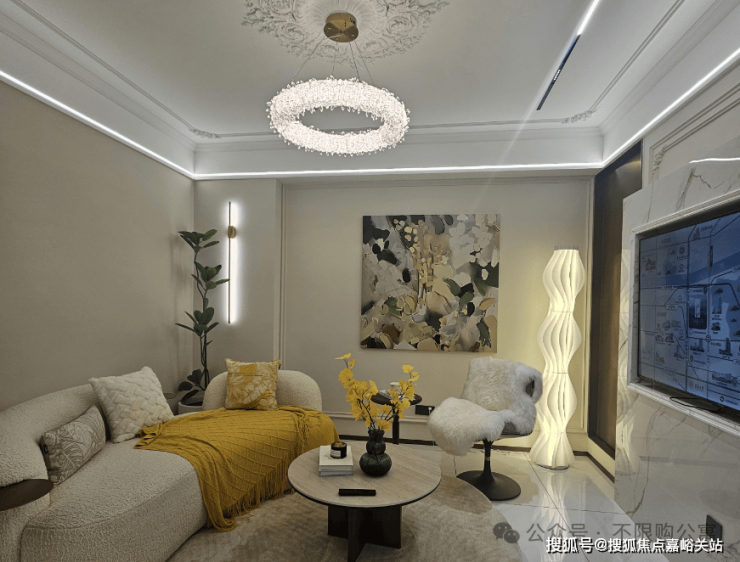 主卧利用延展的石膏线条与抽象挂画尽显轻法浪漫的馥郁温润;米白与粉色的碰撞赋予空间温馨与暖意让人不禁慢下来感受这空间静谧之美。