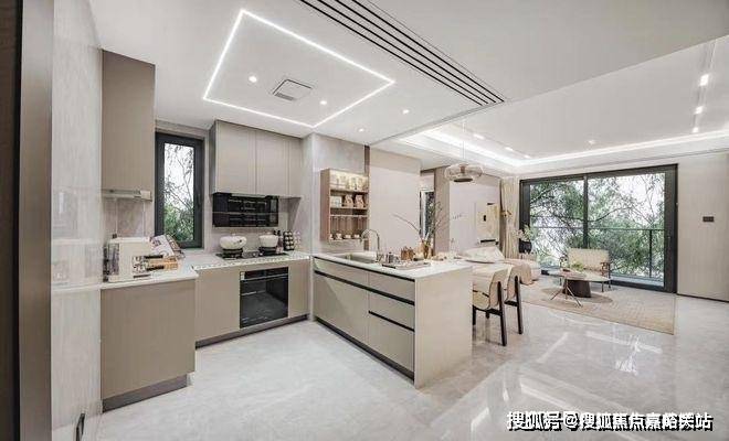 双面加宽组合型岛台,岛台长度从传统的60mm拓展至90mm,拓展操作空间;其他像预留双开门冰箱位、灶台背面大板砖、顶面线性灯+凉霸等人性化品质细节,也都是交付标准!