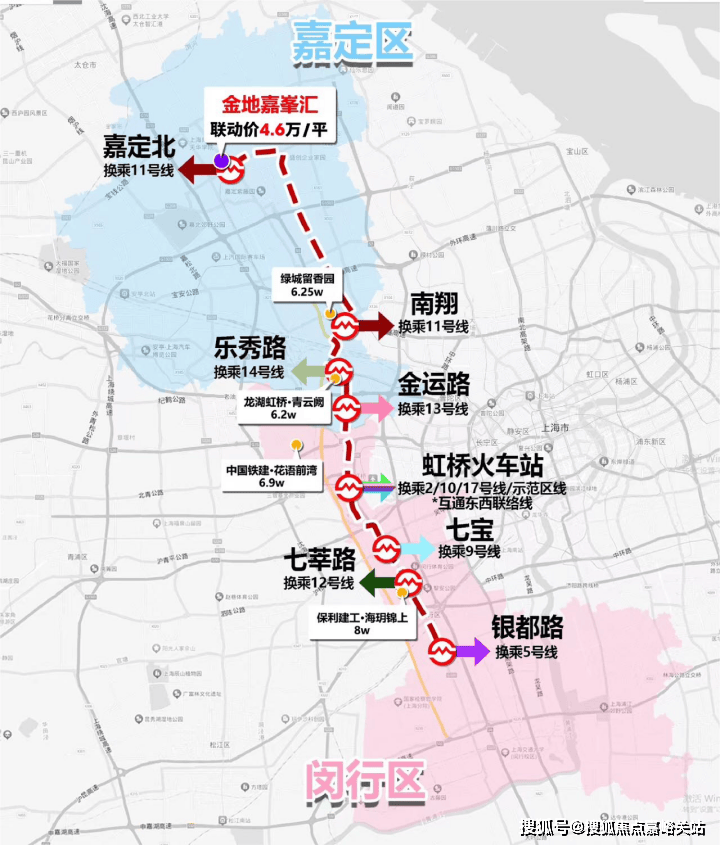 而嘉闵线沿线新盘均价均在6万/㎡-8万/㎡,项目联动价仅4.6万/㎡,总价400万元级潜力盘或许只有金地嘉峯汇。
