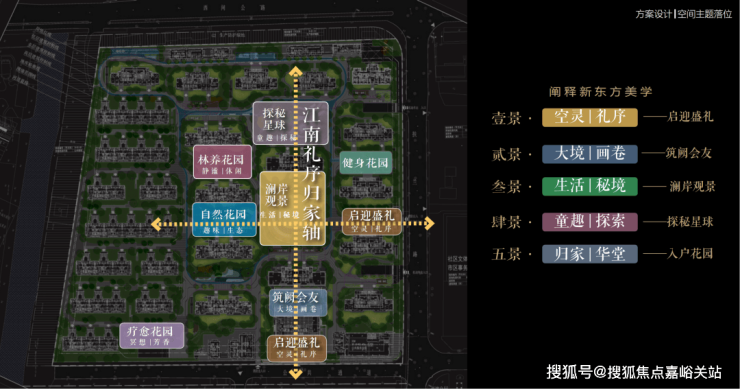 以江南人文精神为源点,打造两轴一环五进空间,江南礼序归家轴串联启迎盛礼、筑阙会友、归家华堂等5重礼制,尊崇归家;健康运动轴以24小时跑道为社区活力生活环,串联儿童乐园、长者康养、疗愈花园等10大生活场景,营造全龄全时的江南诗意生活。