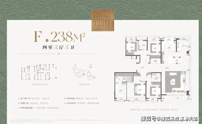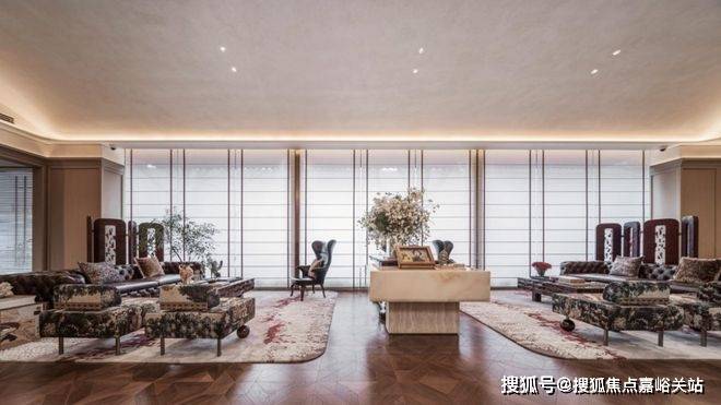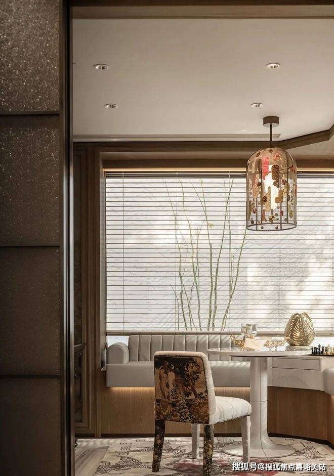 约17.2米环绕观景台:约238㎡户型的客餐厅,位于户型的顶端。自东向南环绕270度的观景台长达约17.2米,在这样的客厅,甚至可以踱步欣赏窗外的满眼梧桐。独立会客厅,可以做小茶室或棋牌,更深一步的隐私感,为专享客群定制。