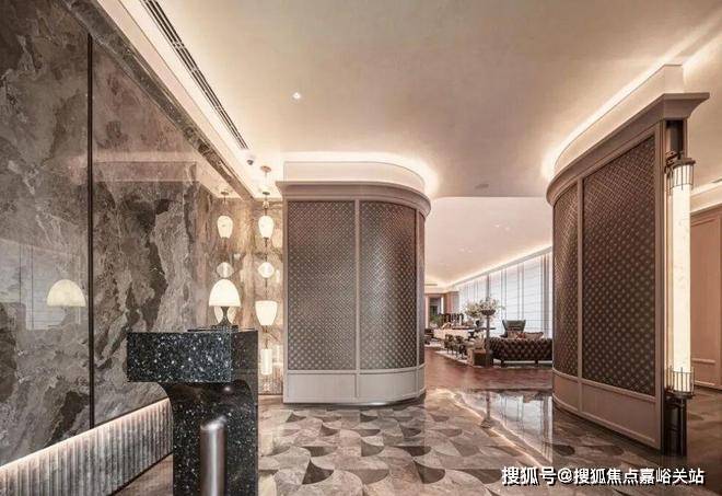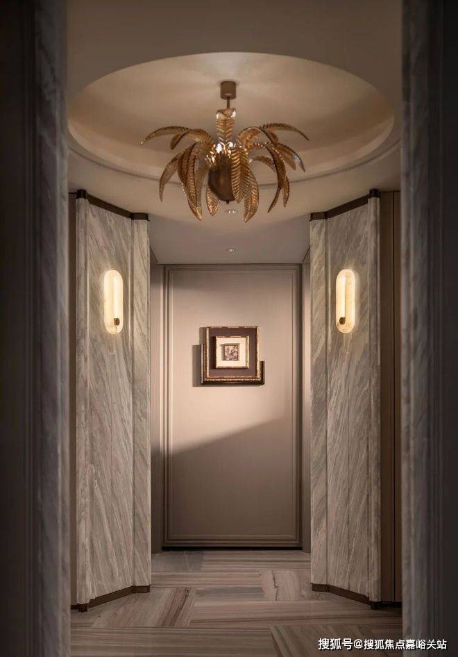 经典十字序列厅:从私享电梯厅开始,经由对开入户门,首先就进入这样一个十字序列厅,视线远处,就是尽头观景台,这条长廊,可以是公私分区的交通枢纽,也可以是彰显主人品味的艺术长廊;