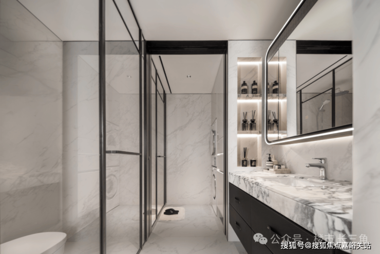 ✔卫生间地面和墙面整体性也非常强,奢石台面的纹路和岩板墙面和协调。