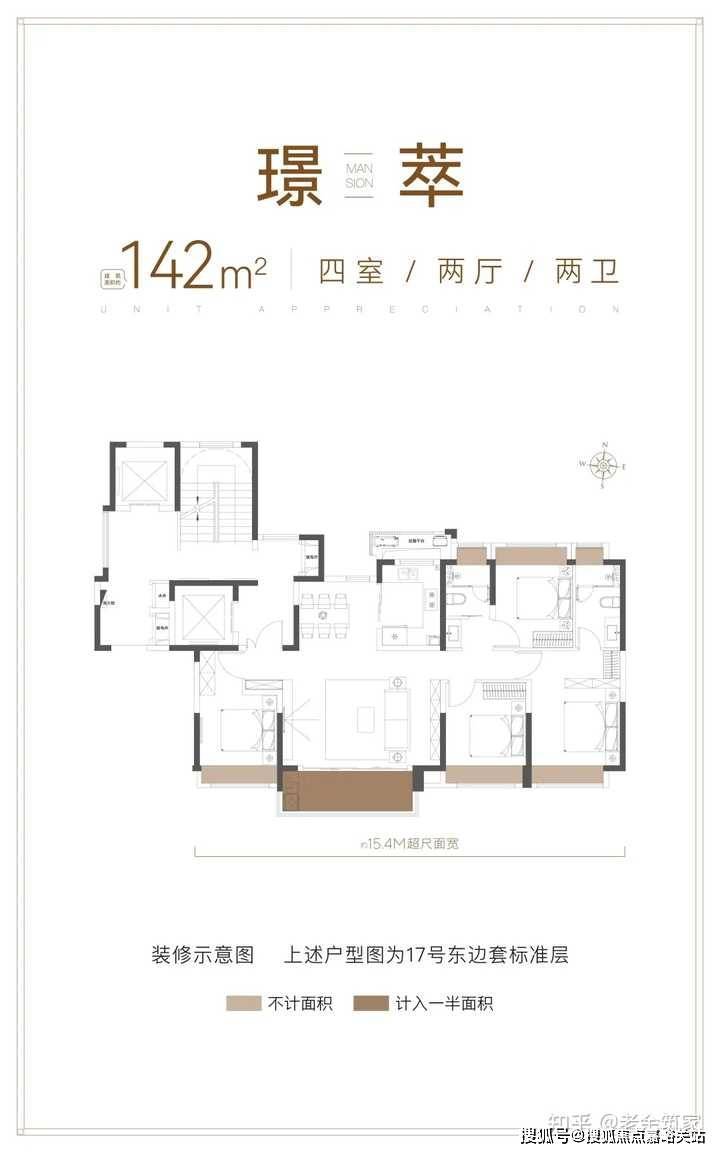 (2)、142平的南北通4房2厅2卫,面宽15.4米,其中三房朝南,类一梯一户,享独立电梯厅