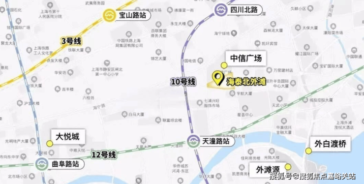 周边500米范围内, 12号线天潼路站 、 10号线四川北路站 环绕。车行主干道: 北横通道 、 大连路 、 新建路 、 外滩隧道 , 南北高架 、 延安高架 等。