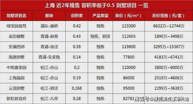 放眼全上海,目前容积率低于0.5的在售别墅盘,不超过10个,主力总价3000-6000万,个别房源总价高达1.5亿。