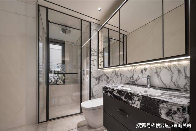 ✔卫生间地面和墙面整体性也非常强,奢石台面的纹路和岩板墙面和协调。