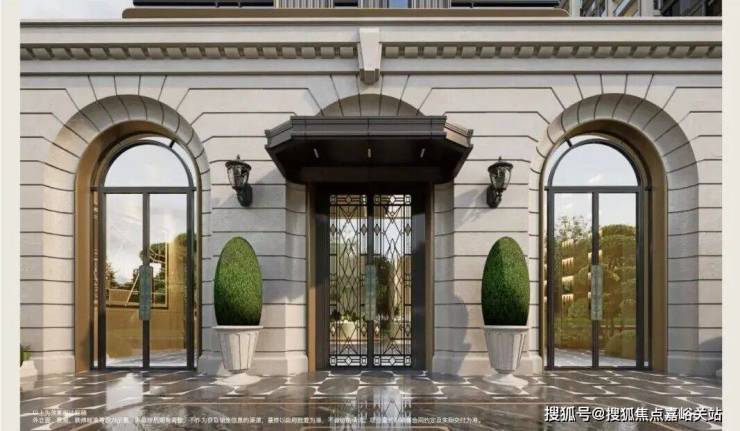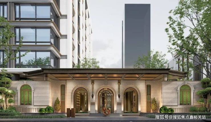 首先,项目西侧人行主入口大门,采用 经典的拱券序列符号 ,以浅色石材、咖色金属与玻璃的精致搭配,营造出复古奢华的归家仪式!