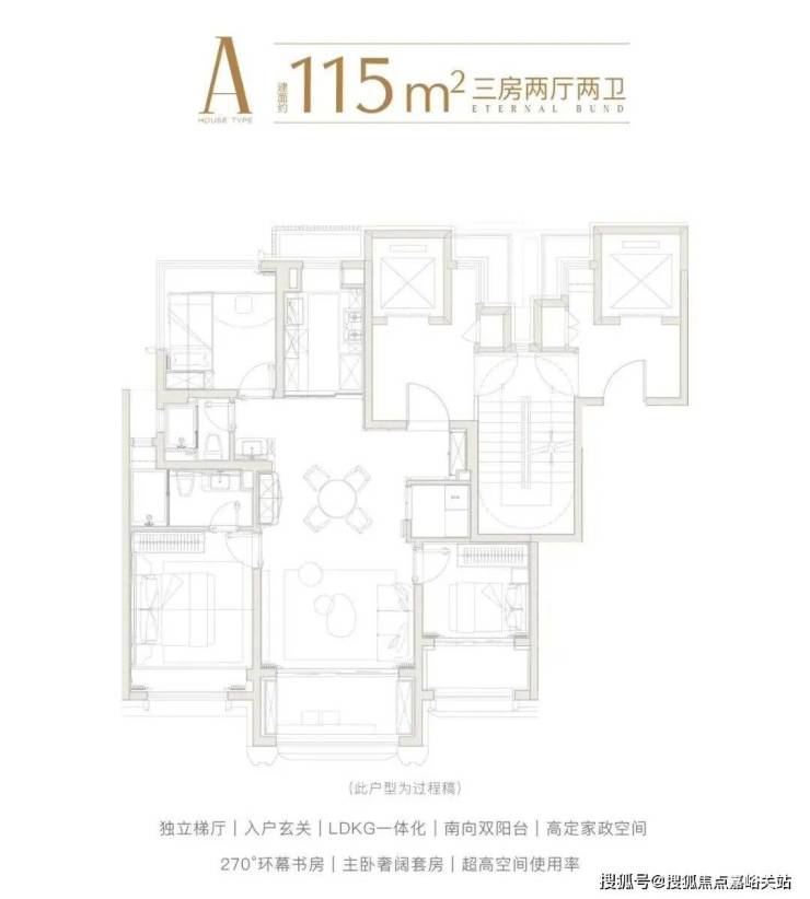 115㎡户型采用 南向三开间朝南的全明飞机格局,客厅与次卧双阳台设计,按常规规则阳台一半面积免费赠送,再加上近乎零过道的空间规划,让室内实得率突破93%!