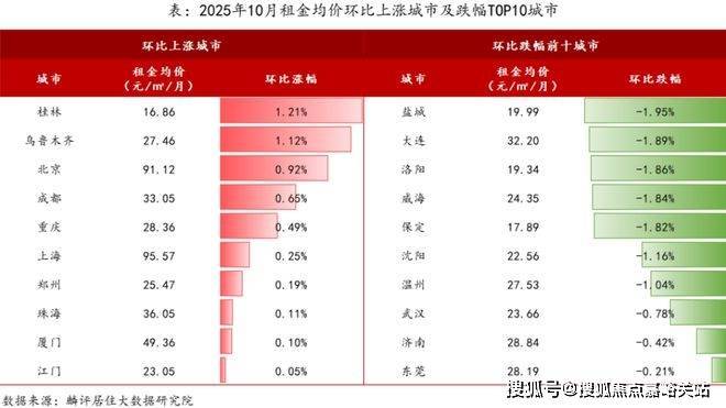 麟评居住大数据研究院近日发布的报告显示,2025年10月全国40个大中城市租金挂牌均价为34.01元/㎡/月,环比下跌0.08%,同比下跌2.49%,环比跌幅较上月收窄0.14个百分点。