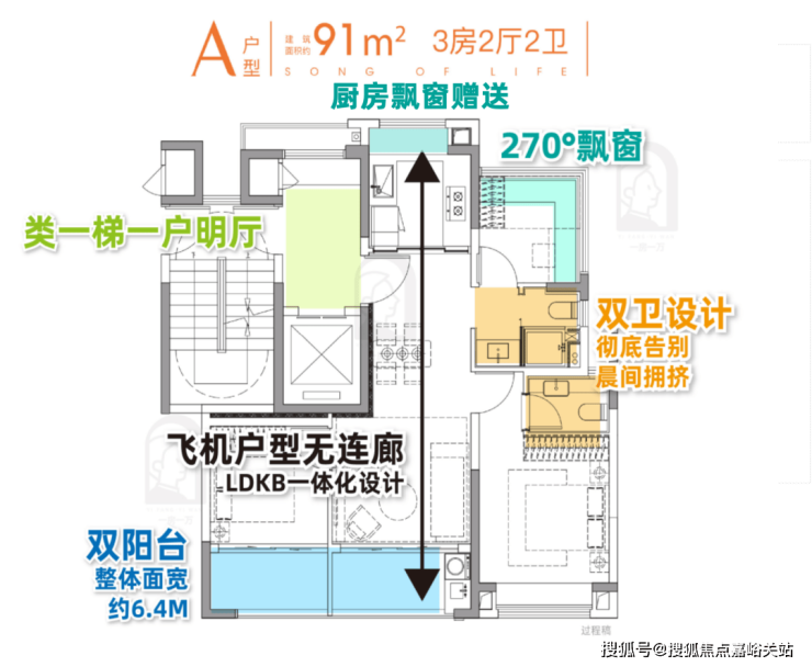1.建面约91㎡3房2卫:双阳台+无连廊+双卫,质价比之上功能与通透兼得
