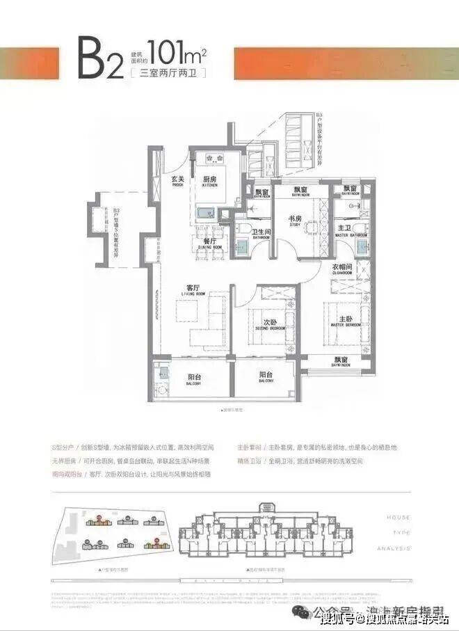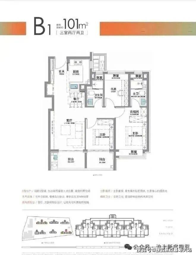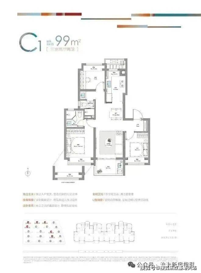 建面约99㎡三房:该户型是典型的飞机格局,很大程度上提高了使用率