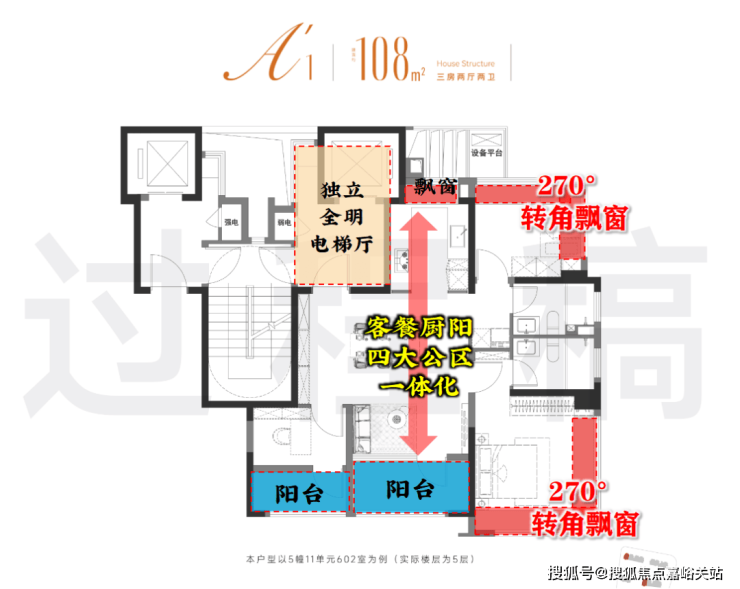 值得一提,当很多豪宅还在用转角飘窗打动客户,项目却在这个 500w级新盘上拿出南北 双 270度「全景舱户型」。
