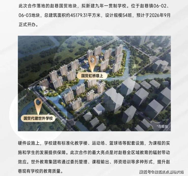 9月5日“世外”正式官宣落定赵巷,这所世外托管的公办九年制学校为国贸代建学校,与项目仅一路之隔,未来大概率对口。(期房不承诺学区,学区划分以教育局公布为准)。