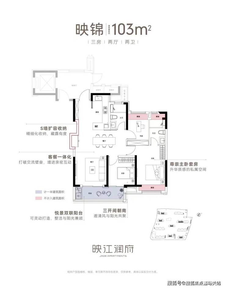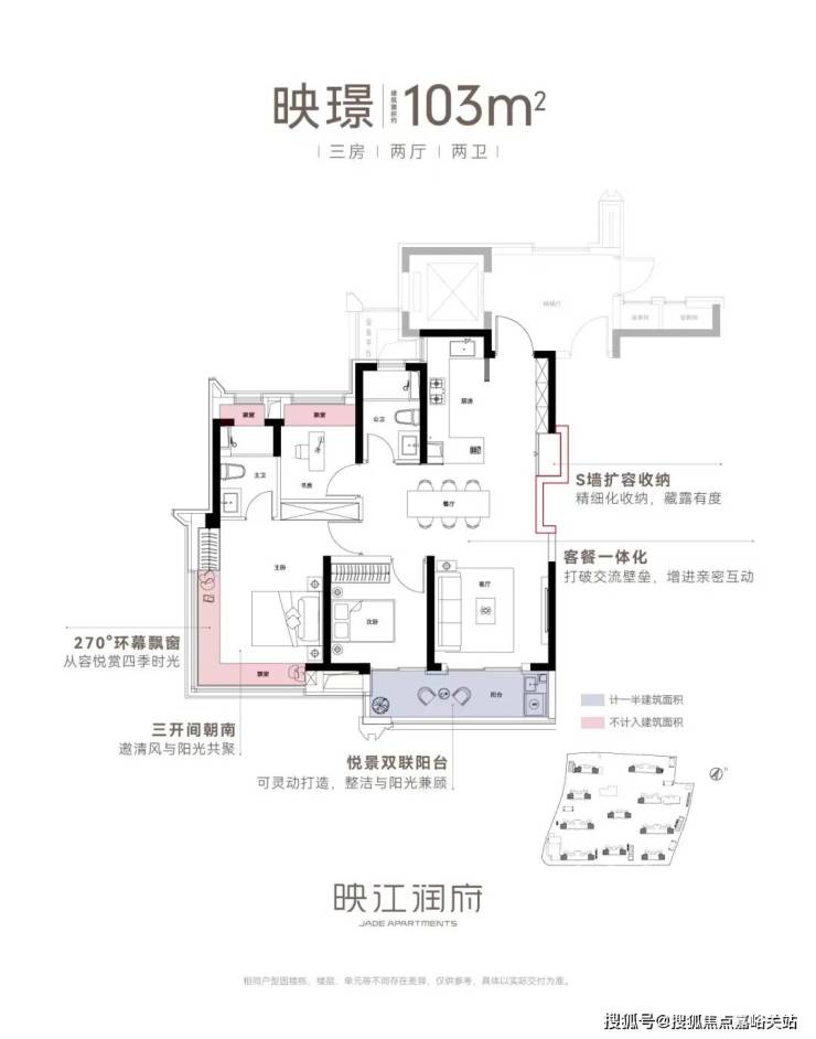 亮点五:双联阳台+多飘窗赠送、灵动空间。映江润府103户型,实现了100平级别难得的双联阳台,实现了室内空间的横向延伸,同时,搭配主卧、主卫、书房的“全飘窗”设计,赋予了空间更多灵动的使用场景。