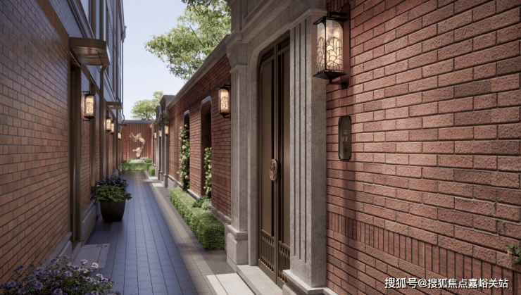 一幕为海派门仪,也是项目的主入口,约10.7米阔绰门庭尺度的海派里弄门楼界面,极致的对称仪式布局,延续建筑红砖肌理,甄选天然红洞石,还原那一抹隽永而厚重的经典色彩,既有大地般的沉稳,又透出低调的奢华感。