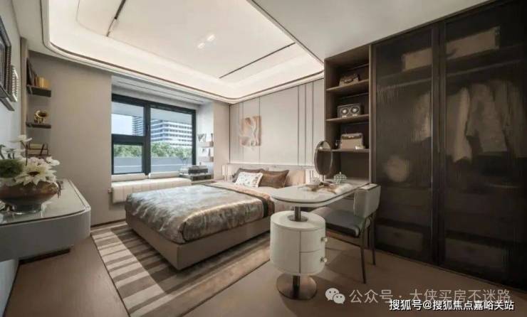 不过尺度感更为出挑:首先是主卧大套房贯穿南北,自带衣帽间+卫生间+飘窗,气度非凡,尊崇备至。其次客餐厨一体化设计,整个公区几乎没有面积浪费,营造的空间感和尺度感远超同价位其他竞品!