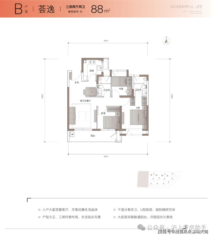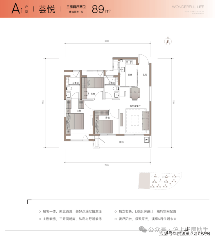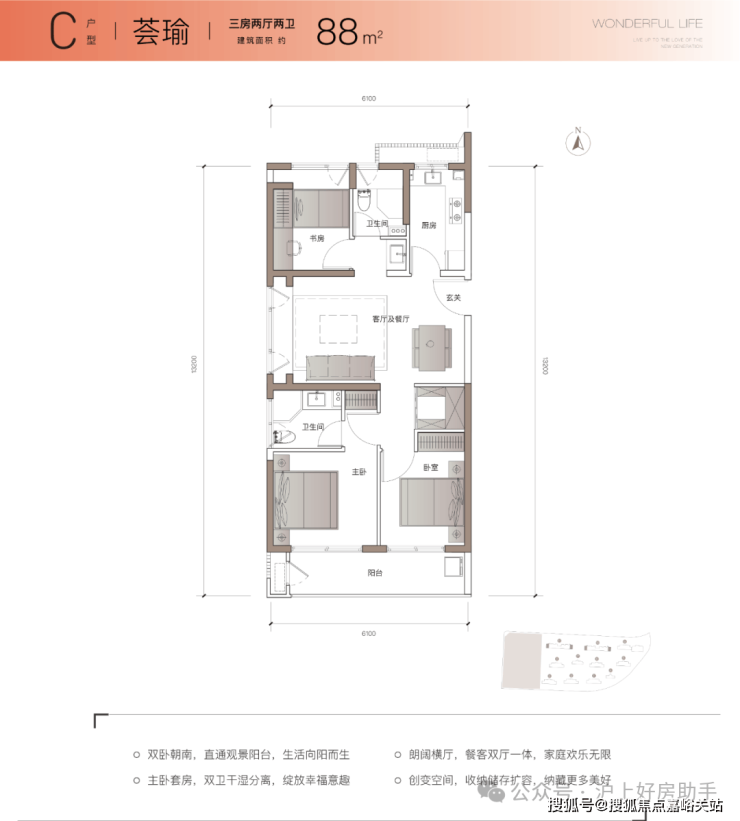 项目主力户型建面约 89m²3房2厅2卫 ,近10米南向面宽,约6.3米的超大阳台打造更舒适的空间尺度感