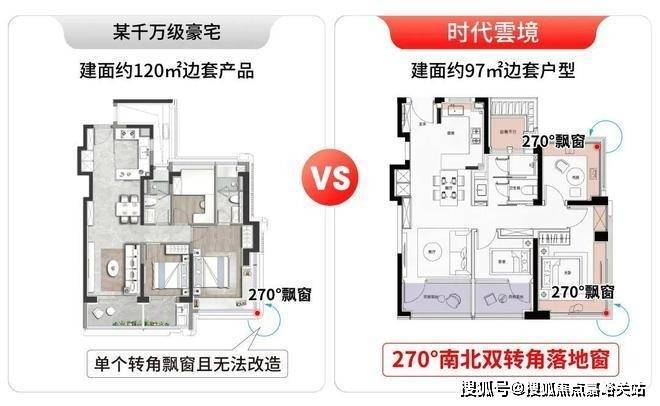 时代雲境建面约95-97㎡的房源不仅是边套,还设计了270°南北双转角落地窗。