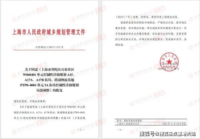 近日,上海市普陀区石泉社区W060401单元控制性详细规划A15、A17A、A17B街坊,槎浦物流基地PTP0-0001单元5A街坊控制性详细规划局部调整正式获批。