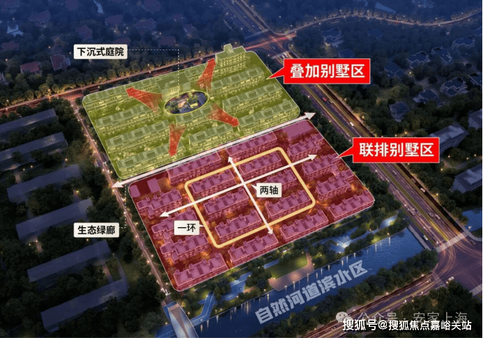项目以东西向生态绿廊为界,将园区分为两个墅区。北侧4层叠加别墅区以下沉庭院为中心,增强社区邻里的互动交流体验;南侧3层联排别墅区采用“一环两轴”规划布局,南向直面天然河道。