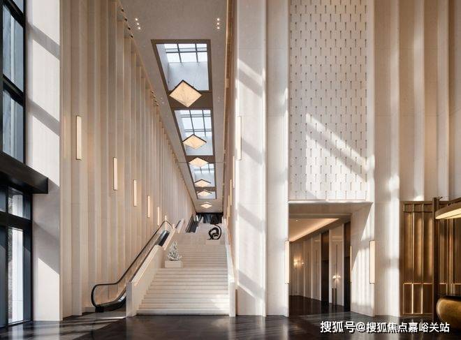 项目会所由水平线设计品牌创始人兼首席创意总监琚宾亲自操刀设计-10。会所入口以和平饭店的海派旋转门系统为灵感,推门而入即见约14.5米的挑高大堂,超高的艺术阶梯之上最大程度引入自然光,带来沉浸式归家体验-10。