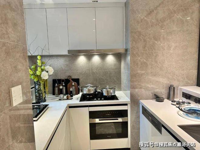 品尊国际售楼处电话:4008569058收纳体系是一大亮点。厨房拥有几乎两面墙的收纳空间,一边是灶台这里做了上下橱柜,另一侧是嵌入烤箱、蒸炉、冰箱等电器产品;