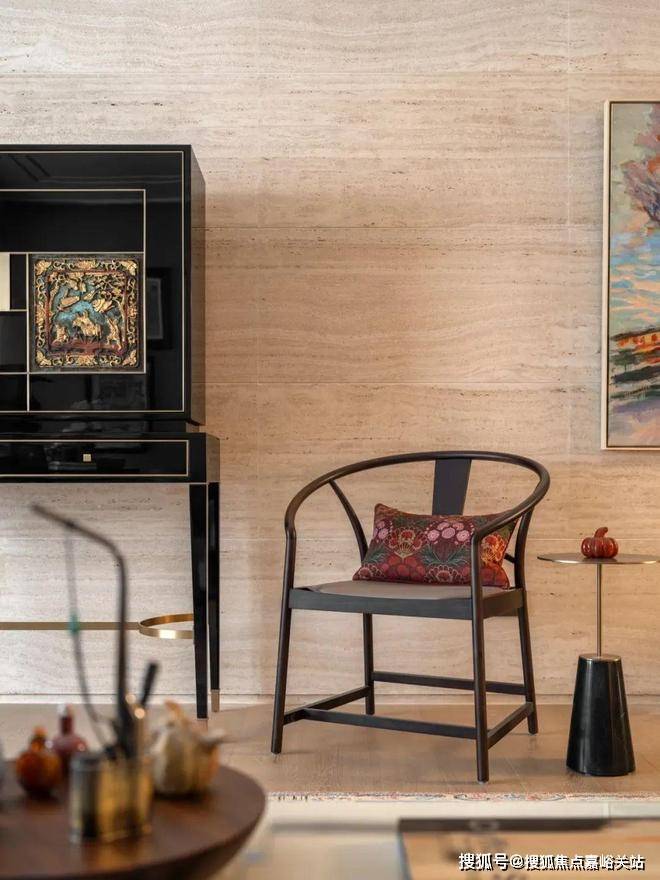 天潼198售楼处电话4008569058☑️☑️融合焕新的高柜摆放于洞石墙前,哑光与纹路丰富的米白洞石衬托出了高光黑色烤漆的深邃与沉静。而嵌入柜面的中式楠木挂屏无疑是点睛之笔,采用朱红鎏金工艺对人物和图案进行着色,展现了传统与现代完美融合的可能性。天潼198售楼处电话4008569058☑️☑️