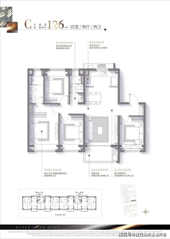 该户型做到了同面积段罕见的 四开间朝南+四房设计,南向IMAX级景观面,卧室阳光满溢,功能性也拉满。