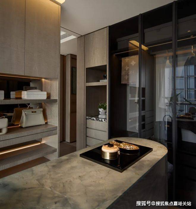厨房的巨量收纳系统,超大尺度的中西岛台,既符合中式烹饪的实用逻辑,预留足够操作台面,又能承载西式社交,还有新颖的转角蝶形收纳——