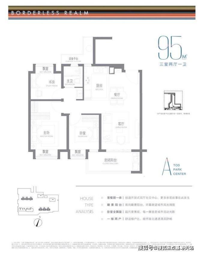 建面约95m²户型特点:开放式厨房,极度释放厨房与客厅的尺度与互动可能,无连廊设计,一梯两户极致梯户比,南北通透舒适感