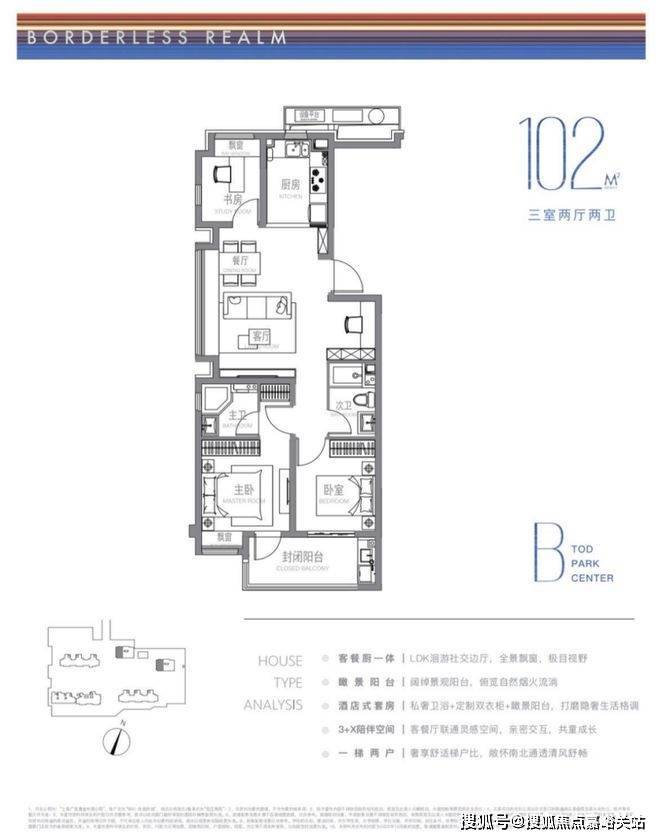建面约102m²户型特点:LDK洄游式景观边厅,景致拉满,3+X陪伴空间,承载更多自定义功能需求,开放式厨房,烹饪与客餐厅无界互动。