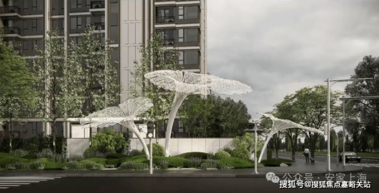 连廊绿化:以奉贤“公园城市”的理念为原点,结合街角绿化与单元门屋顶景观,创新打造立体的景观界面,使连廊成为一道绿色的风景。